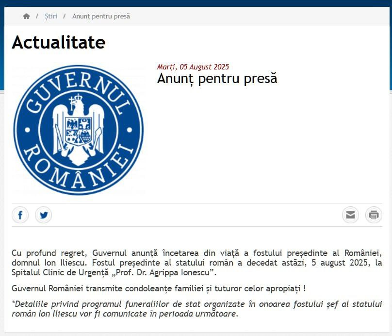 "Cu profund regret, Guvernul anunță încetarea din viață a fostului președinte al României, domnul Ion Iliescu. Fostul președinte al statului român a decedat astăzi, 5 august 2025, la Spitalul Clinic de Urgență „Prof. Dr. Agrippa Ionescu”. Guvernul României transmite condoleanțe familiei și tuturor celor apropiați! Detaliile privind programul funeraliilor de stat organizate în onoarea fostului șef al statului român Ion Iliescu vor fi comunicate în perioada următoare".