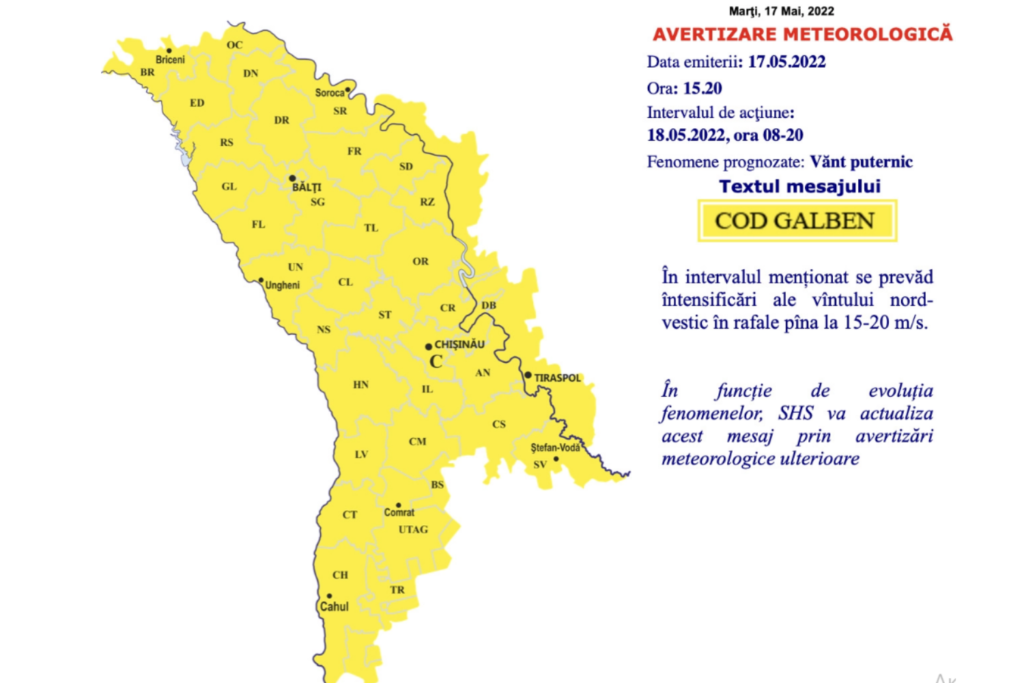 Potrivit meteorologilor, avertizarea va intra în vigoare, mâine, 18 mai, la ora 08:00 și va fi valabilă până la ora 20:00. În perioada indicată se prevăd intensificări ale vântului nord-vestic în rafale de până la 72 km/h.