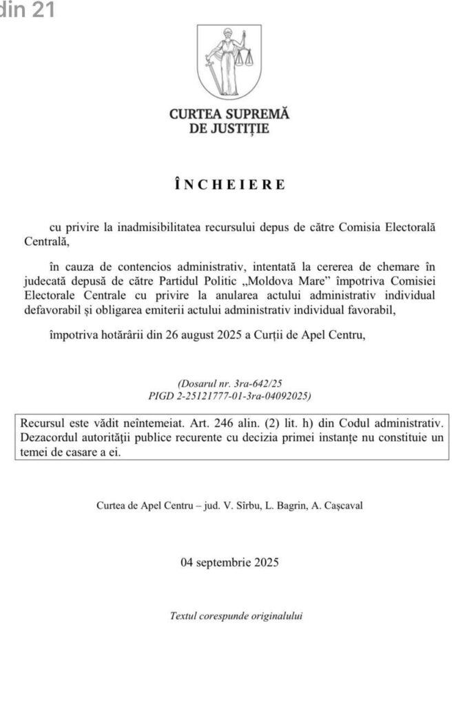 Încă un partid inclus în buletinul de vot. Formațiunea politică a Victoriei Furtună, „Moldova Mare”, va putea participa la alegeri. CEC a fost obligat de Curtea Supremă de Justiție să examineze cererea Partidului Moldova Mare de înregistrare în alegerile parlamentare din 28 septembrie Decizia CSJ este irevocabilă. Astfel, Curtea Supremă a respins recursul CEC ca neîntemeiat. Judecătorii au subliniat că simplul dezacord al CEC cu decizia Curții de Apel nu poate fi motiv de anulare.