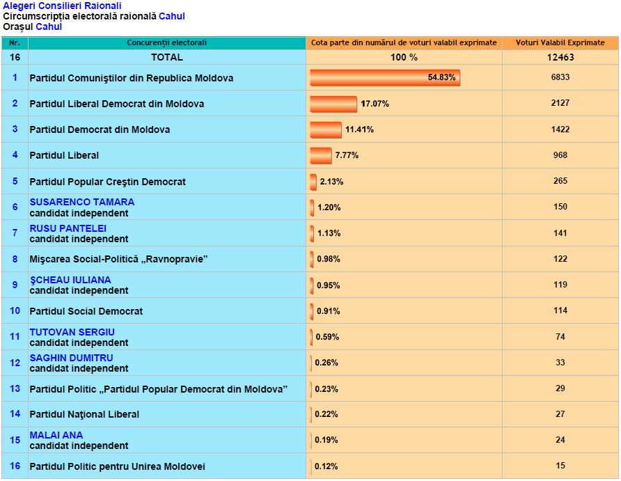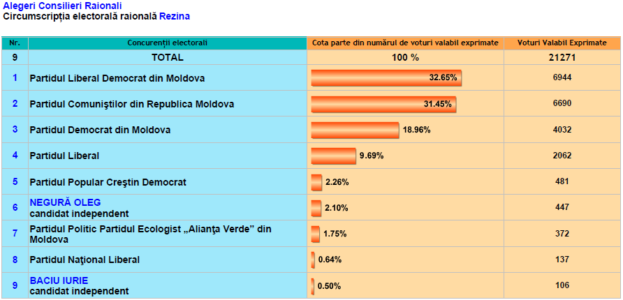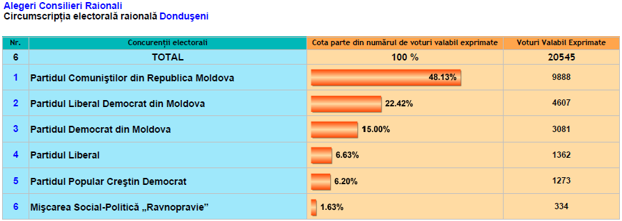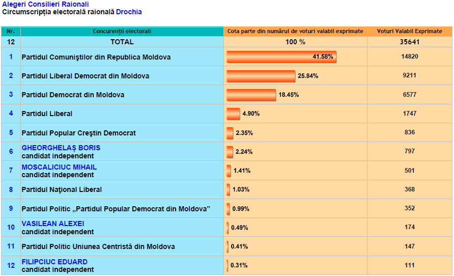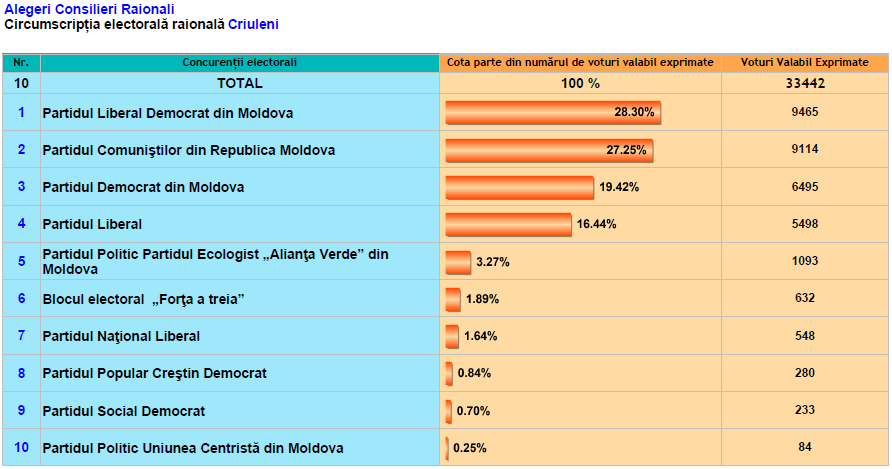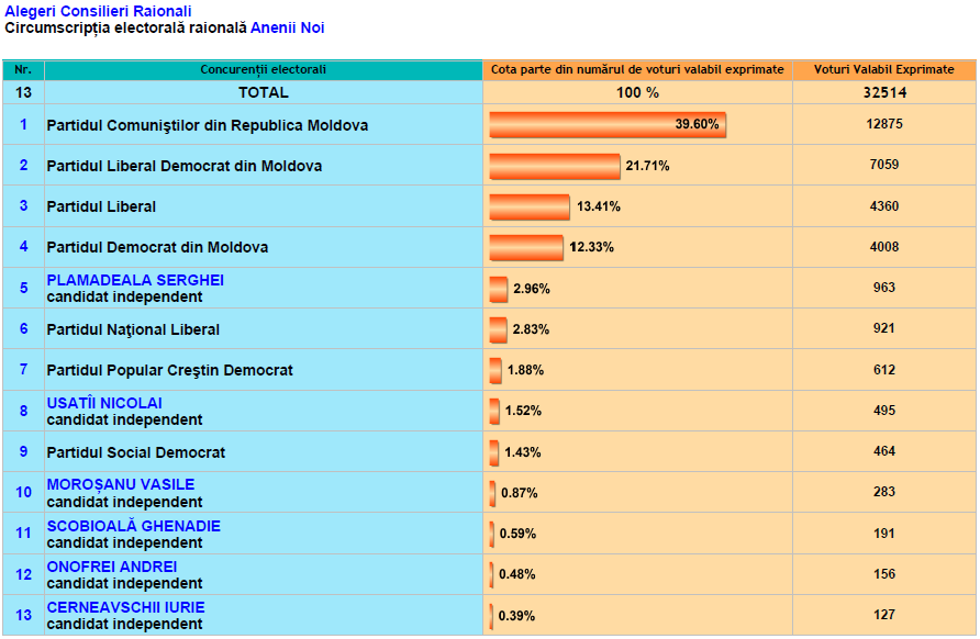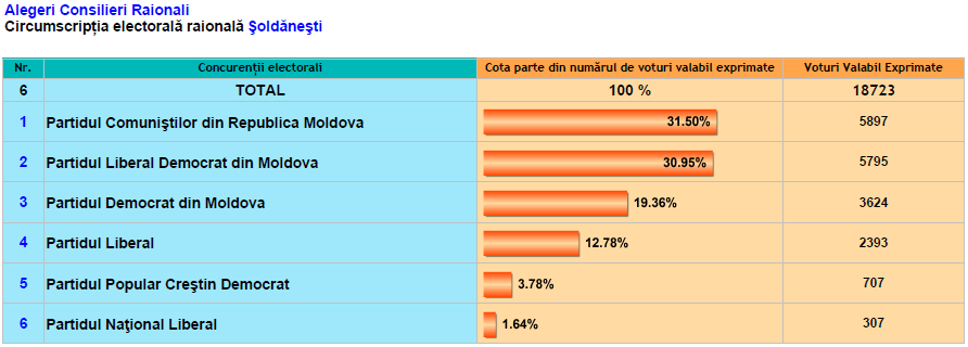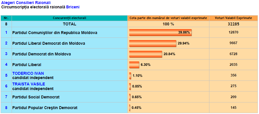 La Anenii Noi, Briceni, Cahul, Criuleni, Dondușeni, Drochia, Ialoveni, Rezina, Șoldănești, Taraclia, Telenești au fost numărate deja100% din voturi. În celelalte raioane rezultatele se cunosc parţial.