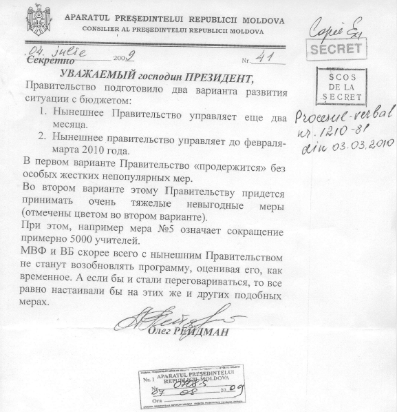 “Insificienţa în sumă de 2167,5 mil. lei ar putea fi acoperită din granturi şi credite externe sau în caz contrar este riscul de finalizare a anului bugetar cu datorii creditoare enorme”, se precizează într-un demers al Consilierului preşedintelui R. Moldova de atunci, Oleg Reidman.