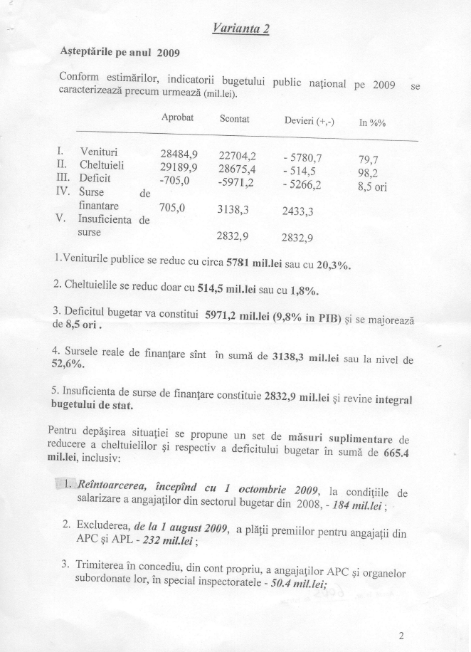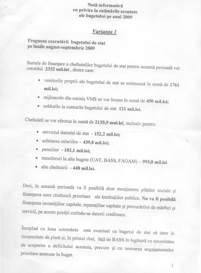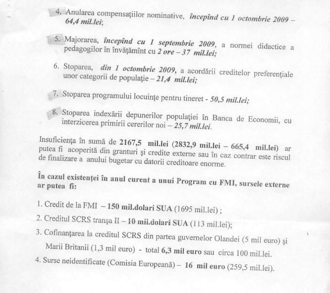Guvernul Greceanîi urma să intre în incapacitate de plată în luna octombrie 2009, iar 5 mii de pedagogi urmau să fie concediaţi, se arată într-un document desecretizat recent. Guvernul comunist intenţiona să facă economii prin diverse metode, printre care trimiterea în concediu forţat a angajaţilor Administraţiei Publice Centrale, anularea compensaţiilor nominative, stoparea programului locuinţe pentru tineret, etc.