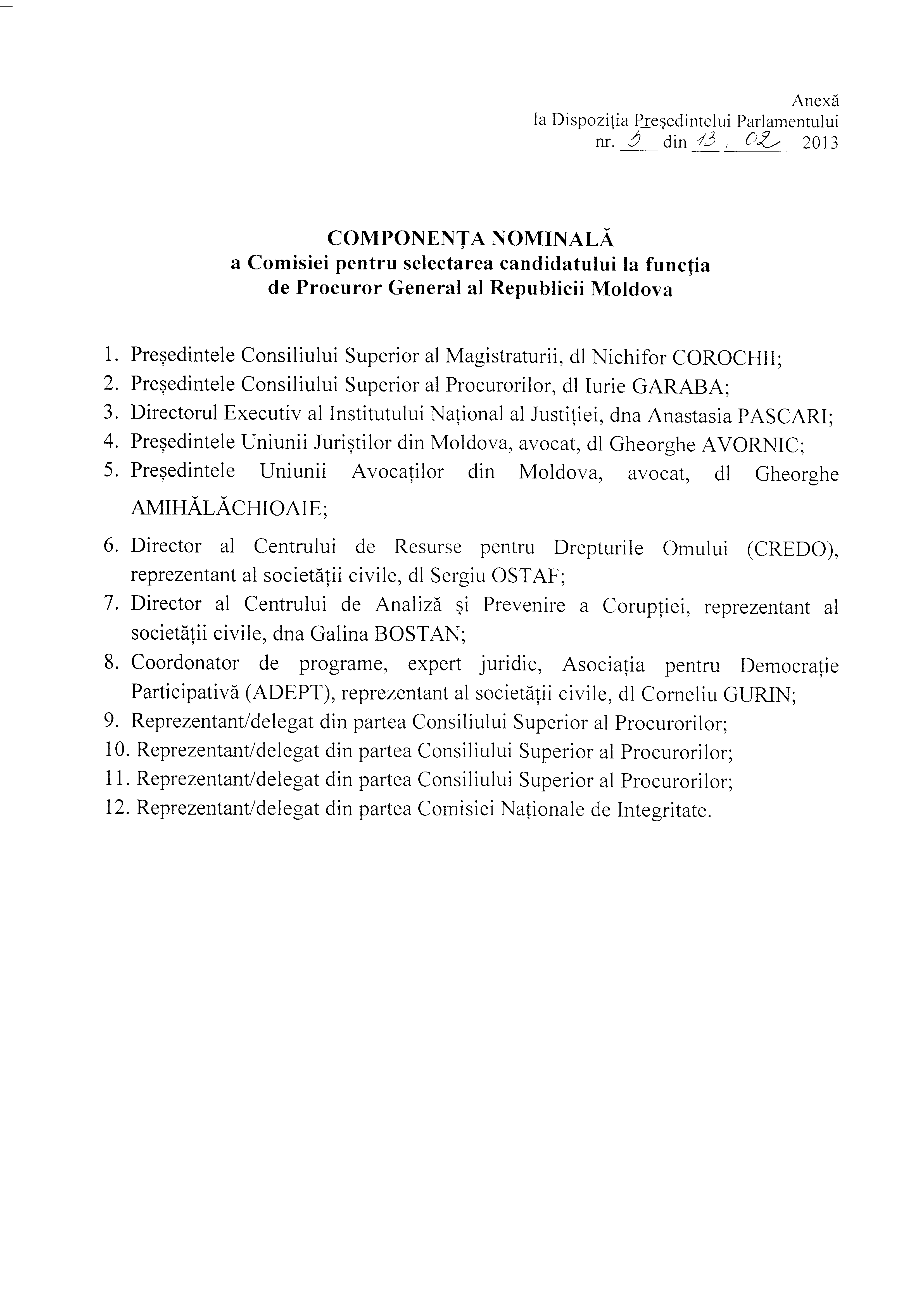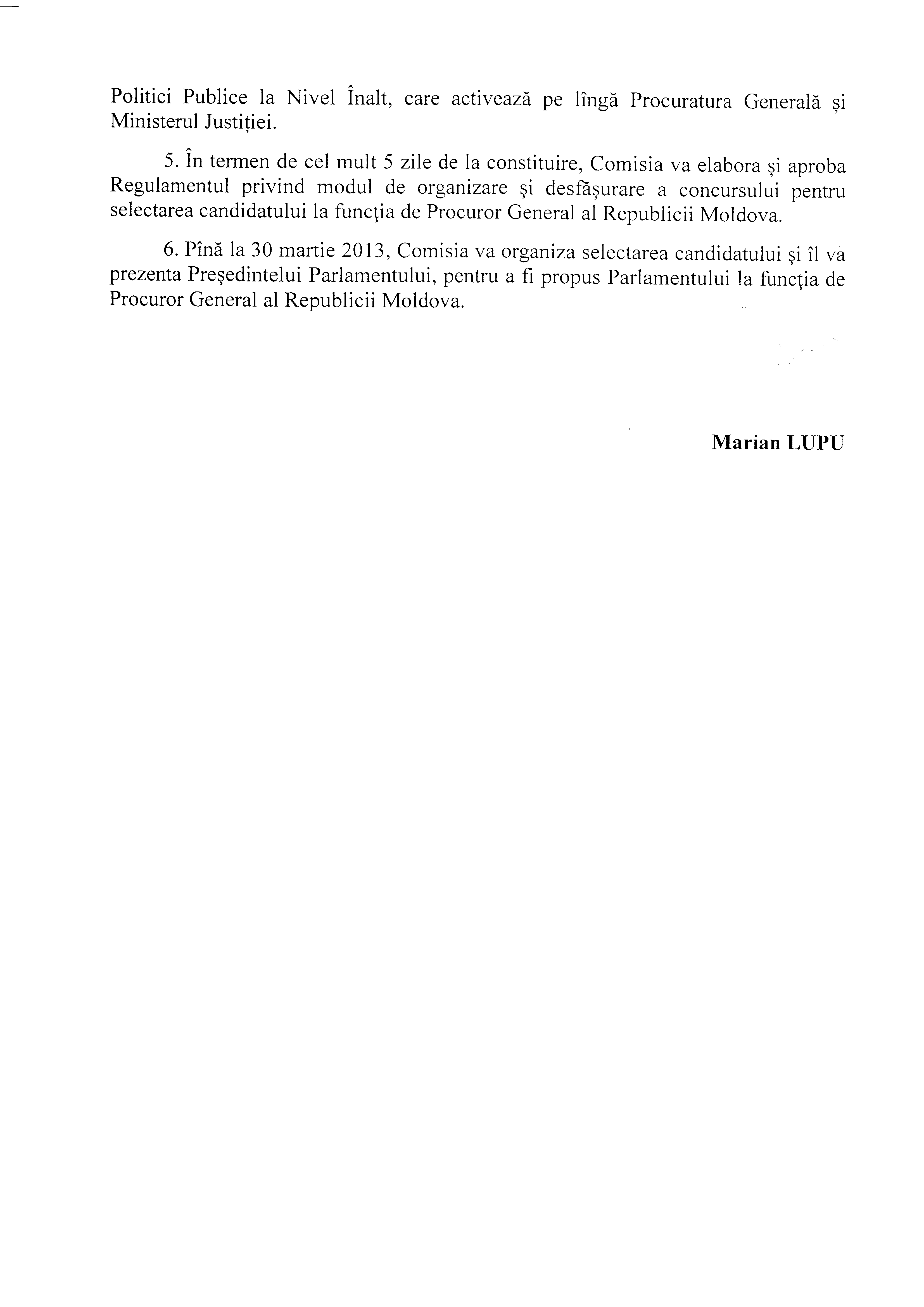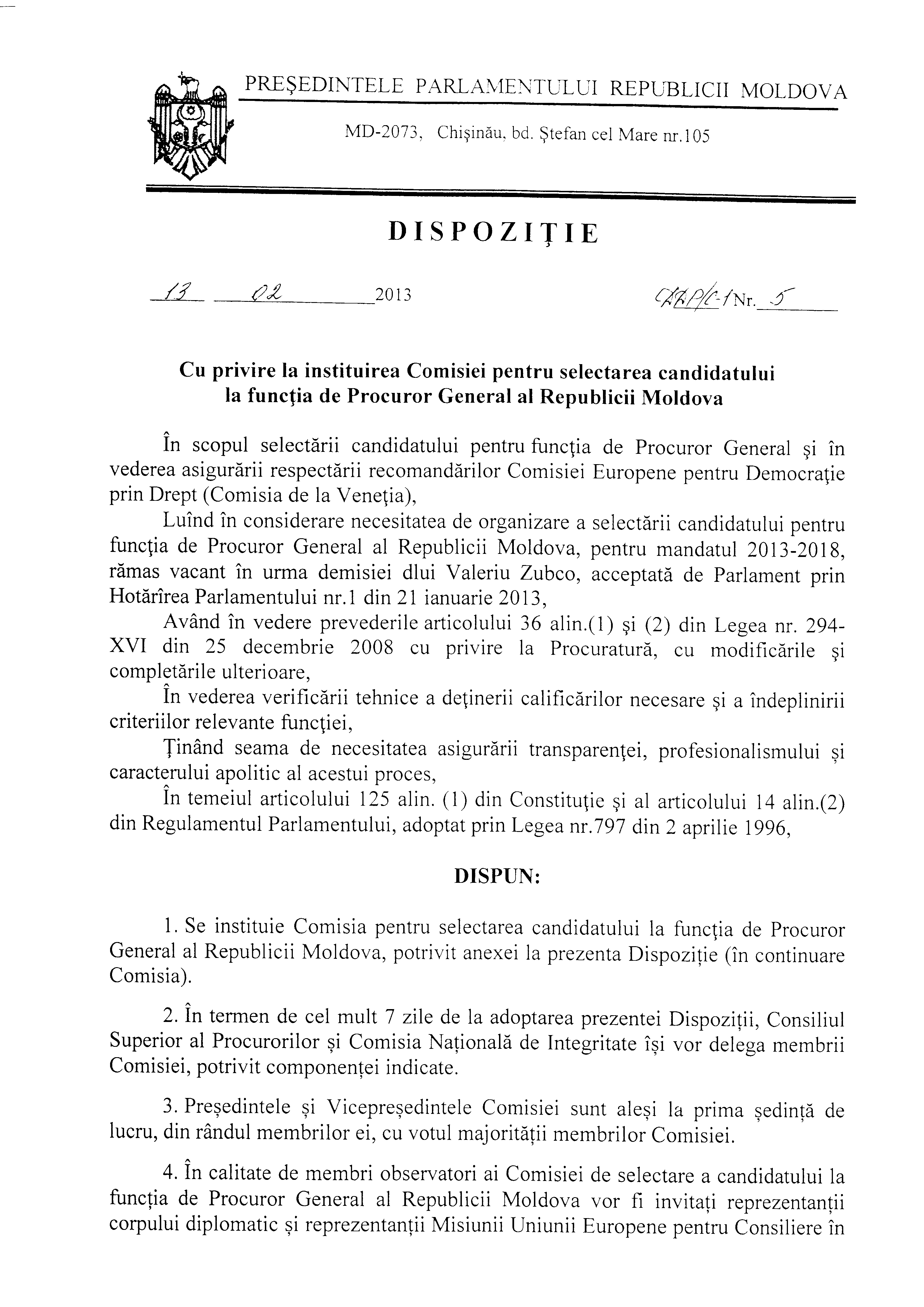 Președintele Parlamentului Republicii Moldova Marian Lupu a semnat astăzi o dispoziție cu privire la instituirea Comisiei pentru selectarea candidatului la funcția de Procuror General al Republicii Moldova, pentru mandatul 2013-2018, rămas vacant în urma demisiei dlui Valeriu Zubco, acceptată de Parlament prin Hotărârea Parlamentului nr.1 din 21 ianuarie 2013.