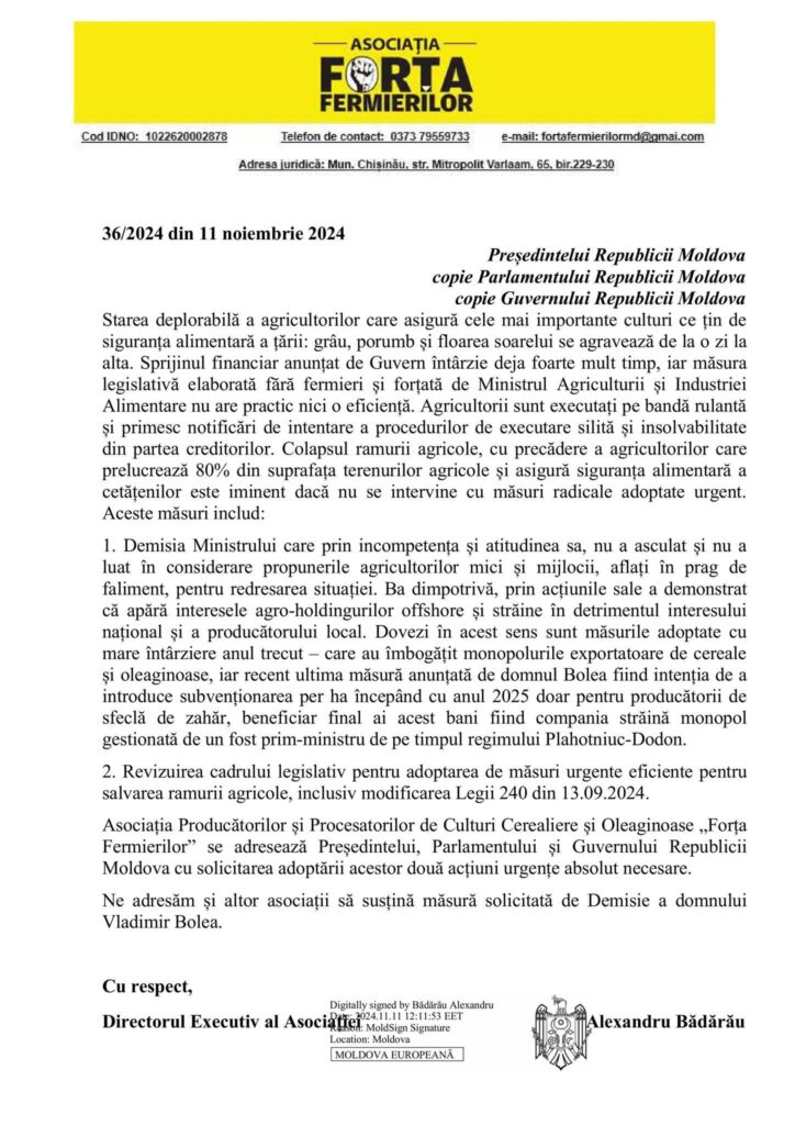 „Măsurile legislative implementate de Ministrul Agriculturii și Industriei Alimentare, Vladimir Bolea, nu doar că au întârziat, dar au și favorizat interesul agro-holdingurilor offshore în detrimentul producătorilor locali. Printre exemplele menționate, se află subvenționarea exclusivă pentru producătorii de sfeclă de zahăr, care ar favoriza o companie străină controlată de un fost prim-ministru din regimul Plahotniuc-Dodon. Este esențial ca Guvernul să adopte măsuri urgente pentru salvarea agriculturii și să revizuiască cadrul legislativ. Solicităm demisia Ministrului Bolea, care nu a ținut cont de propunerile fermierilor și a demonstrat un total dispreț față de interesele naționale”, se menționează în apelul Asociației adresat președintelui, Parlamentului și Guvernului.