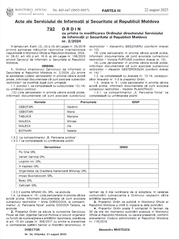 Serviciul de Informații și Securitate a publicat în Monitorul Oficial un nou ordin (nr. 732) prin care modifică și completează lista persoanelor considerate asociate cu oligarhul Vladimir Plahotniuc.