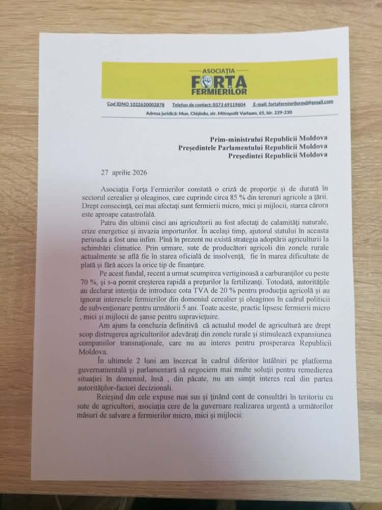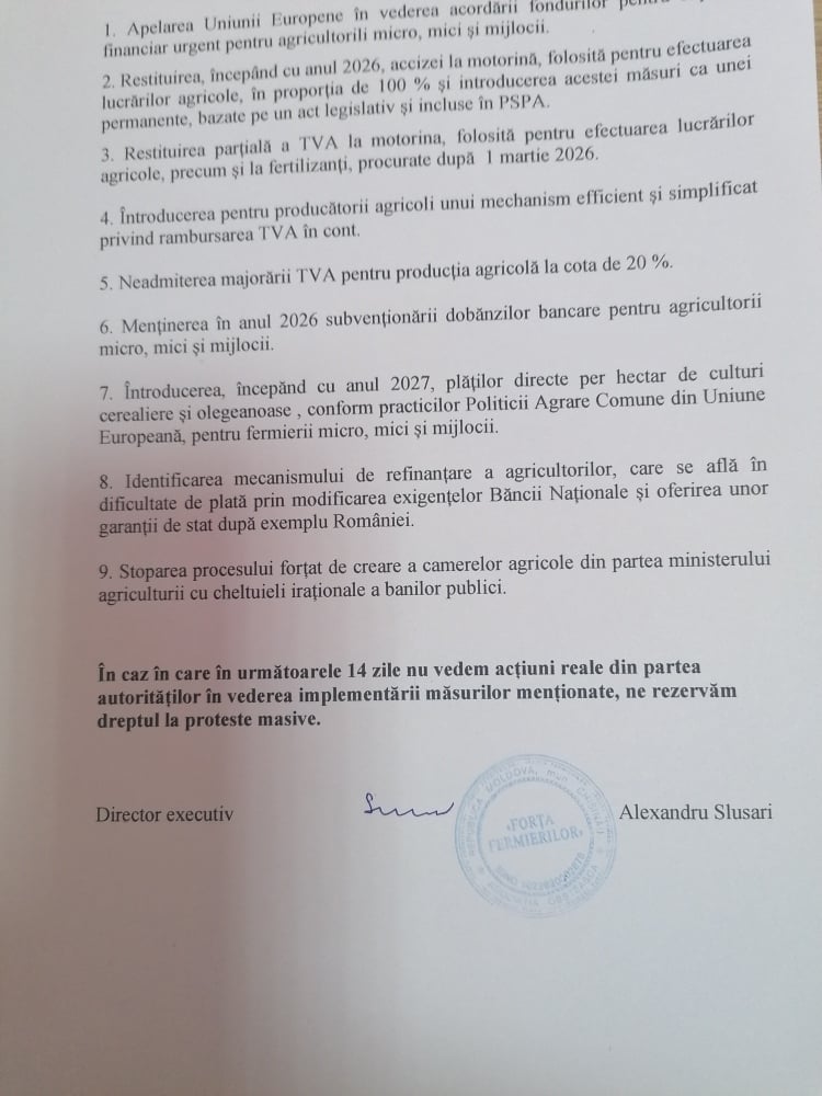 În aceste condiții, „Forța Fermierilor” solicită un pachet de măsuri urgente, inclusiv sprijin financiar extern, restituirea accizei la motorină, rambursarea TVA pentru inputurile agricole și menținerea subvențiilor existente. De asemenea, agricultorii cer introducerea plăților directe per hectar începând cu 2027 și un mecanism de refinanțare pentru fermierii aflați în dificultate.