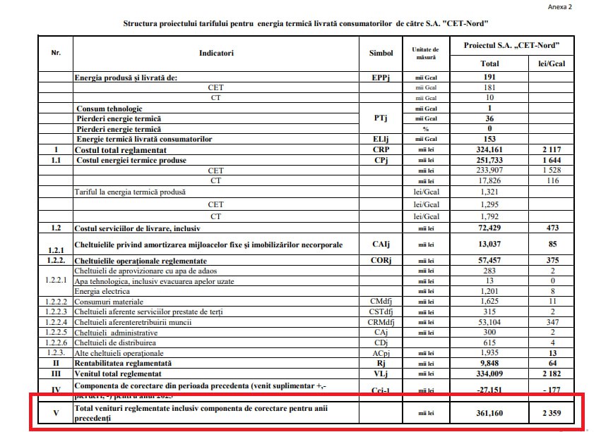 În anexele cererii se arată că tariful propus de 2.359 lei/Gcal include și componenta de corectare aferentă anului 2025, ceea ce explică diferența semnificativă față de tariful actual de 2.136 lei/Gcal. Fără această componentă, veniturile reglementate ale întreprinderii ar fi insuficiente pentru acoperirea costurilor, susține CET-Nord.