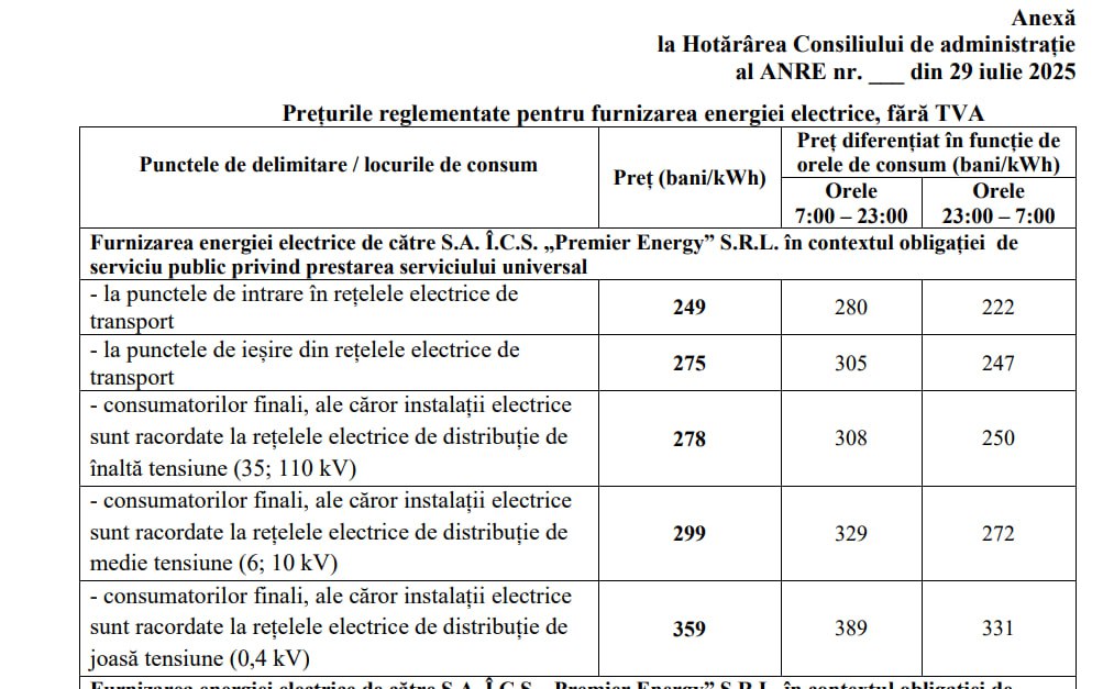 Conform hotărârii, publicate de ANRE, clienții Premier Energy ar urma să plătească 3,59 de lei pentru un kilowatt/oră, mai puțin cu 51 de bani. Iar consumatorii deserviți de FEE Nord ar putea achita 4 lei/kWh, un preț mai mic cu 68 de bani.