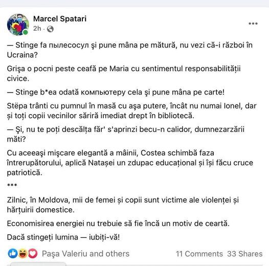 În poastarea sa, Marcel Spătari dă pilde de discuții care, cel mai probabil, există în multe familii din țară și care sunt la limita unei relații adecvate. Astfel, ministrul susține că aceeastă criză energetică nu trebuie să fie un nou motiv de violență domestică în familie și face apel la buna înțelegere.