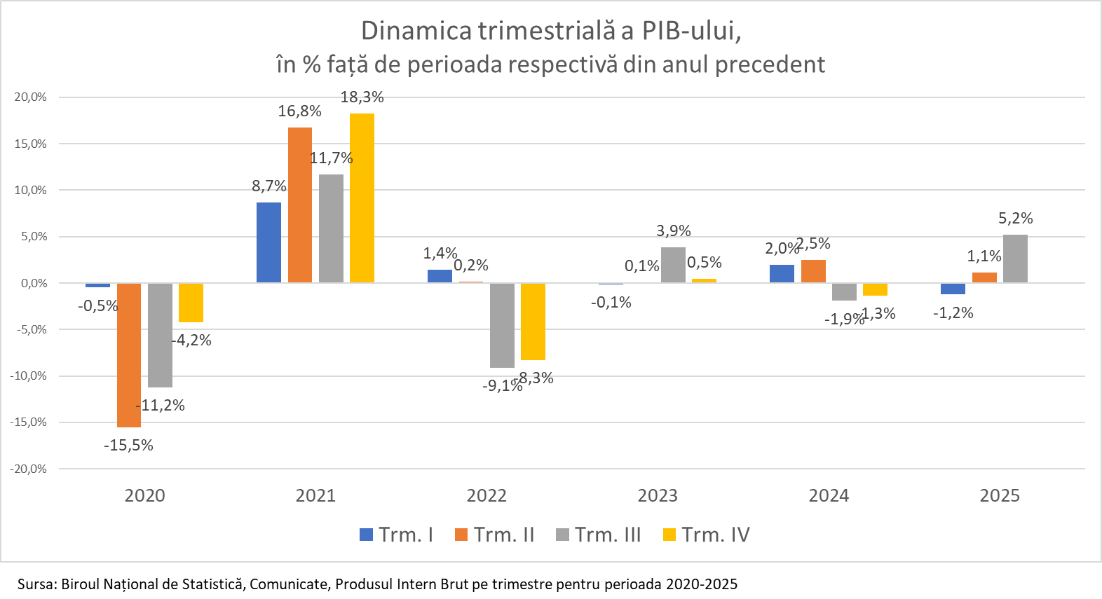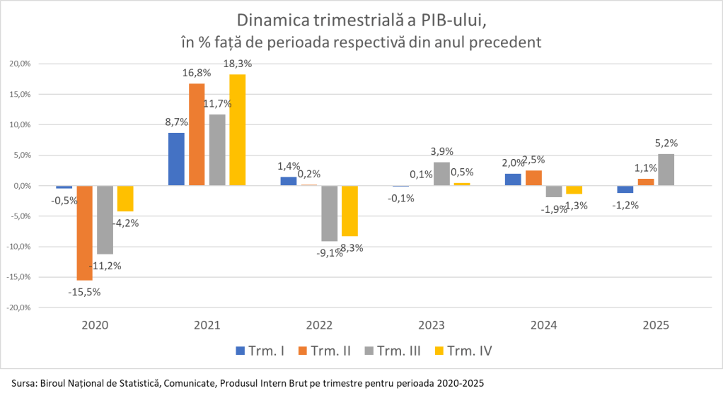 Ultima creștere mai mare decât cea actuală a fost în 2021, un an atipic. Atunci, în trimestrul IV, PIB-ul a crescut cu 18,3%, ca urmare a unei recuperări spectaculoase după prăbușirea din 2020.