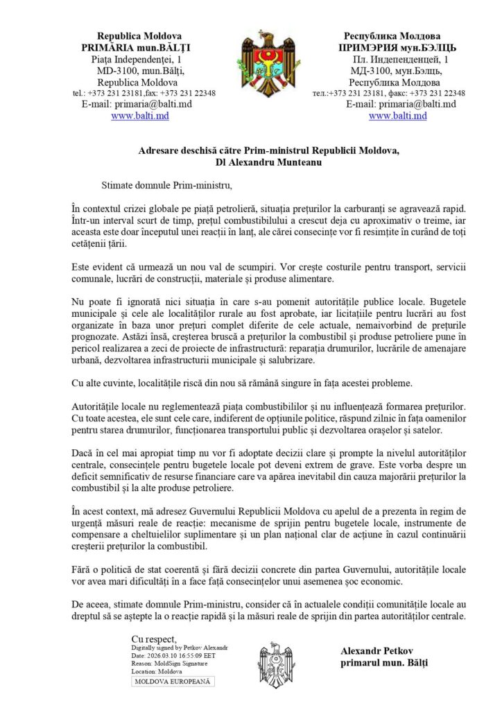 Primarul municipiului Bălți, Alexandr Petkov, a adresat o scrisoare deschisă prim-ministrului Republicii Moldova, Alexandru Munteanu, cerând adoptarea urgentă a unor măsuri de sprijin pentru autoritățile locale, în contextul creșterii rapide a prețurilor la carburanți.