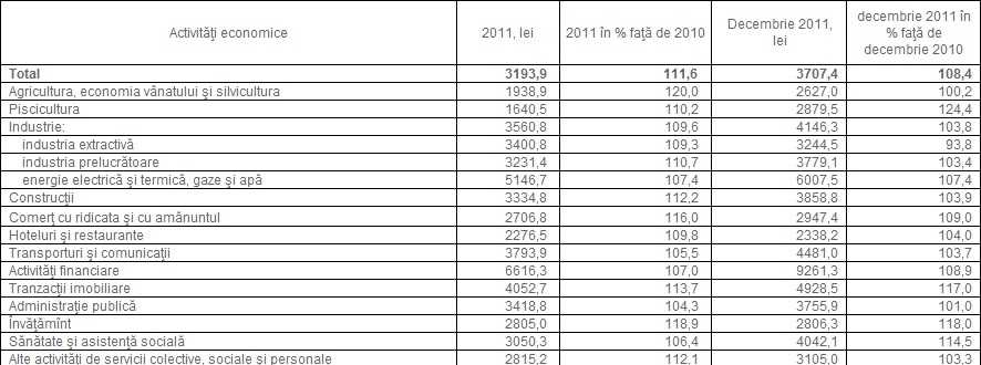 Astfel, în luna decembrie 2011, câştigul salarial mediu a fost de 3707,4 lei, înregistrând o creştere cu 8,4% faţă de luna decembrie 2010 şi cu 14,7% faţă de luna precedentă (noiembrie 2011). Indicele câştigului salarial real pentru luna decembrie 2011 faţă de luna decembrie 2010 (calculat ca raport între indicele câştigului salarial şi indicele preţurilor de consum) a fost de 100,6%.