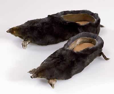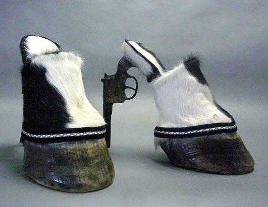 Una dintre cele mai "controversate" creații din colecție este o pereche de sandale care au deasupra doi porumbei impănați care își întind aripile. Nu mai puțin ingenioase sunt papucii care au talpa sau tocul făcute din copite de cai.